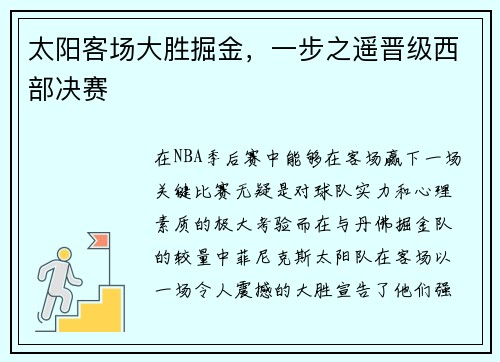 总结来说,太阳队在客场对阵掘金队的比赛中展现了无与伦比的实力和团队精神。他们距离西部决赛仅有一步之遥,而这一步将是他们冲击总冠军的重要台阶。太阳队如果能够继续保持目前的状态,他们将在接下来的比赛中成为任何对手的强大挑战者。