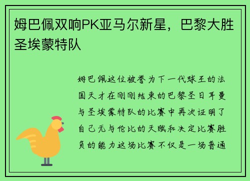 姆巴佩,这位被誉为“下一代球王”的法国天才,在刚刚结束的巴黎圣日耳曼与圣埃蒙特队的比赛中,再次证明了自己无与伦比的天赋和决定比赛胜负的能力。这场比赛不仅是一场普通的联赛较量,更是一次新老球星之间的激情碰撞。在巴黎的王子公园球场,姆巴佩用他标志性的速度和精准的射门技术,再次让全场观众为之疯狂。